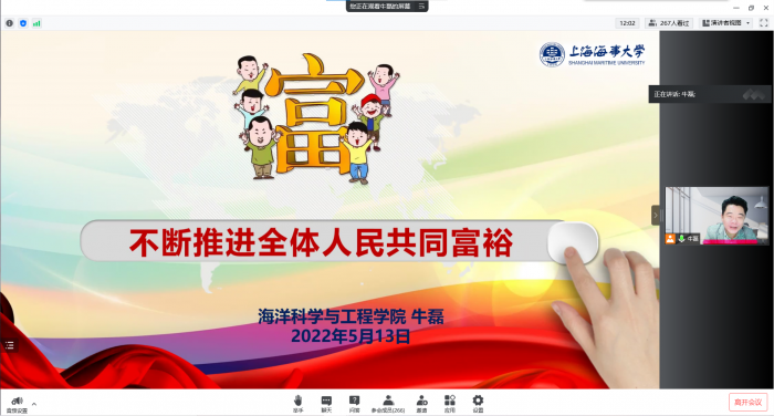 为强化学生爱党爱国爱社会的政治情感,进一步促使学生树立崇高的理想信念,结合疫情防控需求,海洋科学与工程学院2020级于5月13日20:25线上开展本学期形势政策教育课程第四讲,本讲题为“不断推进全体人民共同富裕”,由海科2020辅导员牛磊老师主讲。