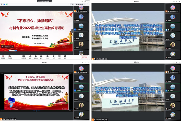 为进一步坚定毕业学生理想信念,树立正确的世界观、价值观和人生观,做好毕业生离校教育工作。6月15日下午,海洋材料学生党支部与海洋材料教工党支部在线联合开展以“不忘初心,扬帆起航”为主题的材料专业2022届毕业生离校教育活动。支部全体成员及材料专业2022届毕业生参加了本次活动,活动由海洋材料教工党支部书记张福华老师主持。