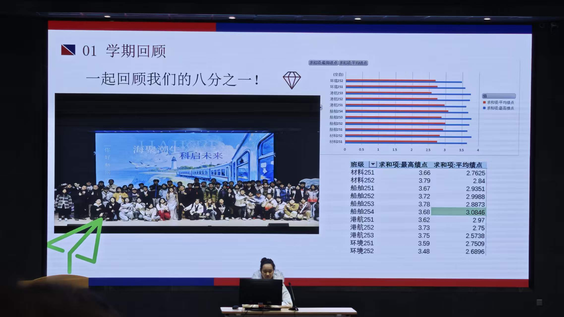 会议伊始,现场播放了学期回顾视频,带领同学们重温大一上学期的点滴瞬间:军训场上的挥汗如雨、迎新晚会的青春绽放、班级团建的欢声笑语、考前冲刺的挑灯夜读……一幕幕熟悉的画面唤起集体记忆,现场氛围温馨而感动。