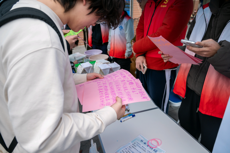 DIY体验环节中,同学们在志愿者的耐心指导下,精心装饰吊牌、小心翼翼埋入种子、精准控制水量浇灌,在亲手操作中真切体会“小水杯”与“大水网”的紧密关联,深刻理解“每一滴水都关乎生态安全”的深刻内涵。活动现场设置的节水寄语明信片悬挂区,成为一道亮眼风景线,师生们驻足提笔,写下对水资源保护的期盼与承诺,一句句真诚的留言,汇聚成守护绿水青山的青春誓言,让亲水、爱水、护水的理念在笔尖传递、在心中扎根。