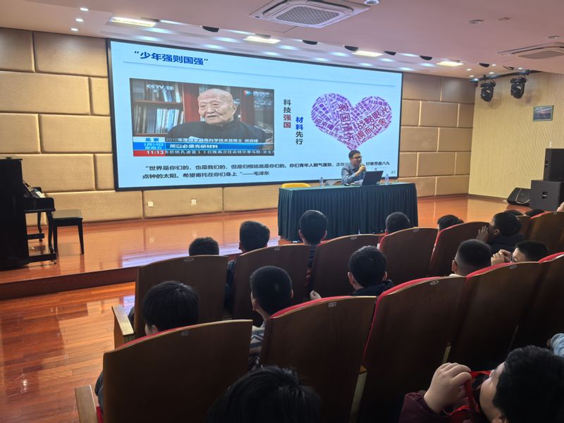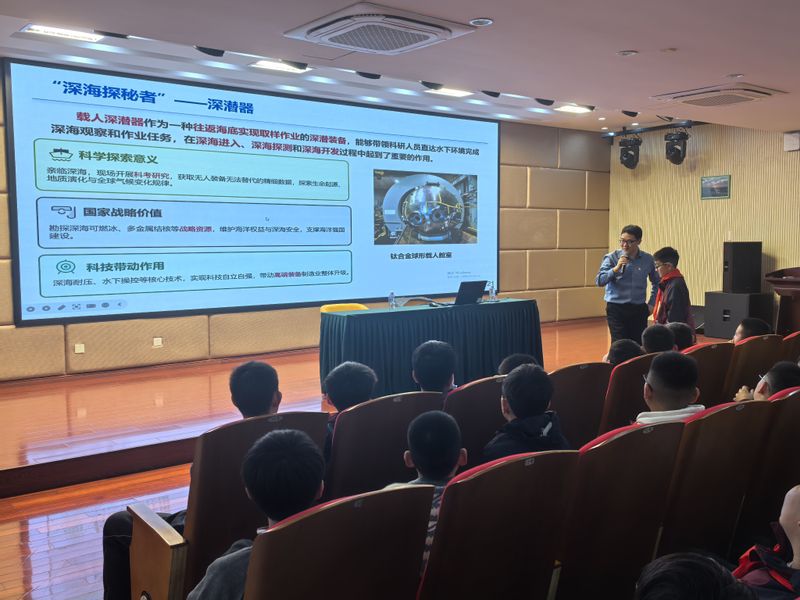 在活动开始之际,孙老师和同学们进行了亲切的互动,迅速拉近了和同学们的距离,奠定了良好的氛围基础。孙老师结合案例、视频和问答方式,用通俗易懂的语言为同学们深入浅出地讲解了钛合金是什么,怎样生产,如何在深海装备中发挥不可替代的作用,以及未来发展需求是什么。他通过寓教于乐的方式,用一张张震撼人心的图片和一段段激动人心的视频,和同学们分享了中国载人深潜事业的发展历程,生动形象地展现了“蛟龙号”“深海勇士”和“奋斗者”号载人深潜器如何实现从无到有、从浅海到深渊的历史性跨越。他特别指出:“同学们今天看到的每一项重大科技突破,背后都凝结着无数科技工作者们‘敢为人先,集智攻关’的奋斗精神。”他更是深情地讲述了钱学森、师昌绪和黄旭华老一辈杰出科学家胸怀祖国、服务人民、勇攀高峰、淡泊名利的动人故事,使同学们深刻感悟到只有将个人理想融入国家命运才能绽放出灿烂光芒。随后的现场互动环节氛围热烈,孙老师与同学们亲切交流、耐心解答疑问,激发了同学们对海洋科技的探索热情。