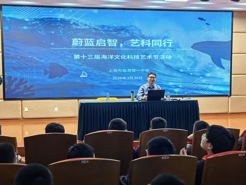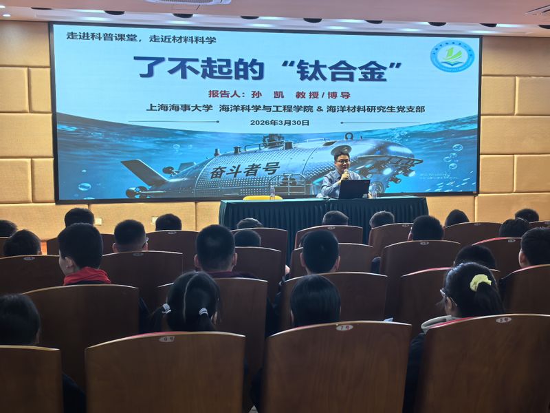 为引导临港新片区广大青少年走近海洋、崇尚科学、涵养艺术,3月30日,以“蔚蓝启智,艺科同行”为主题的第十三届海洋文化科技艺术节在上海市临港第一中学举行。受活动主办方邀请,学院海洋材料研究生党支部书记孙凯老师走进校园,在图书馆报告厅为600余名师生带来了一场题为“了不起的钛合金”的科普讲座。