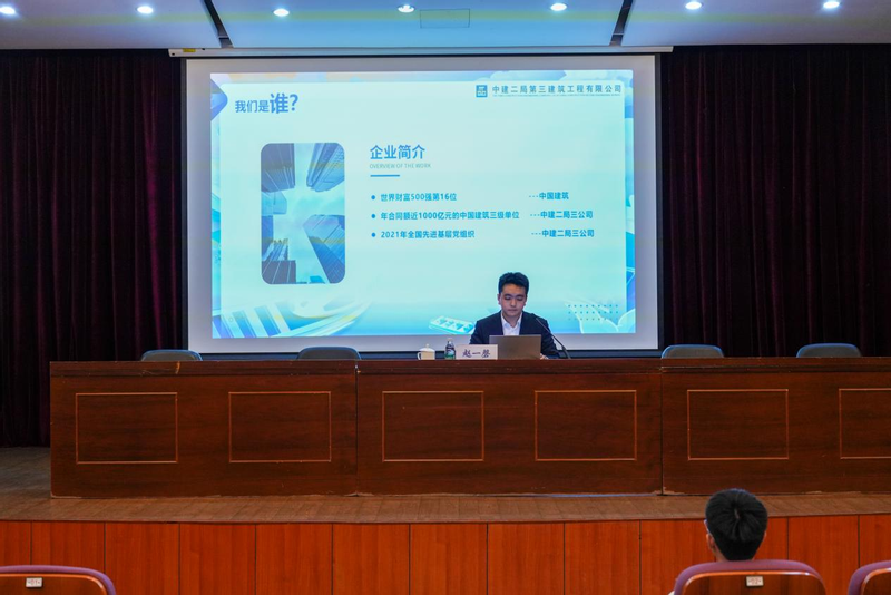 随后,中建二局三公司海大拓展工程项目总工武旭邦以项目实战为切入点,分享了工程技术岗位的职业成长路径。他结合该项目建设的实操经验,深入讲解了工程领域的技术应用要点与职业能力核心要求,鼓励学子深耕专业知识、锤炼实操本领,为未来职场发展筑牢根基。中建二局三公司人力资源部副经理赵一磬则聚焦企业招聘核心需求,系统解读了央企人才选拔标准,全面介绍了智慧建造、工程管理等核心岗位的发展前景与晋升通道,并针对简历优化、面试技巧、职业规划等学子关切的实际问题提供了针对性指导,为校企人才精准对接搭建起直通渠道。