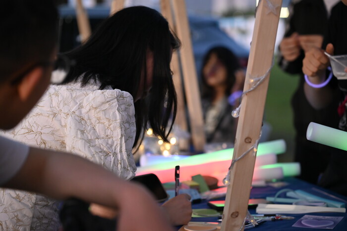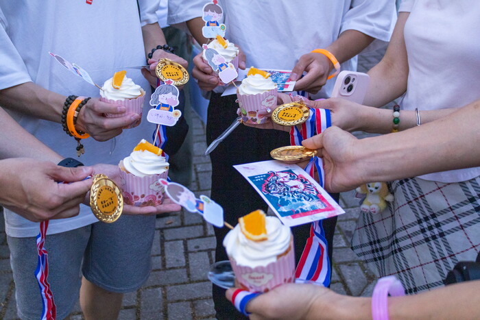 As night fell, the campus was gradually lit up by twinkling glow lights. Students held glow sticks in their hands and wore glow bracelets on their wrists, running in the summer night breeze. In front of the check-in points, rapid breaths mingled with cheerful laughter; some bent over, hands on their knees, sweat beads on their foreheads glistening in the glow, yet unable to hide the smile on their lips. At the finish line, the sweet aroma of cupcakes filled the air, but even sweeter were the cheers that rose and fell along the way, and the handwritten notes quietly stuck on the spray paintings — all the unspoken blessings turned into the softest stars in the night.
