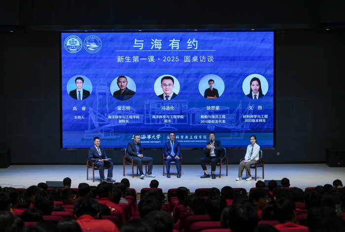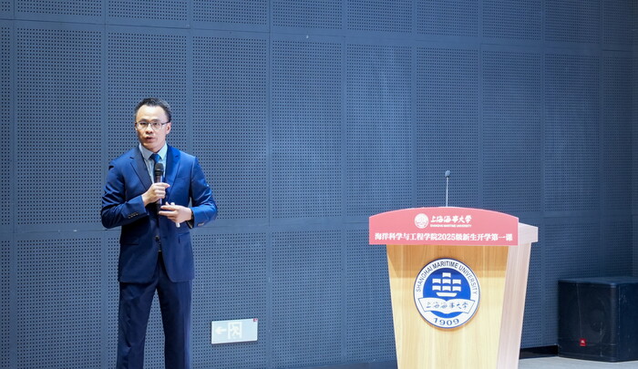 On September 28th, the first lesson for the 2025 freshmen of the College of Marine Science and Engineering, titled "A Date with the Sea", was held in Bangjian Lecture Hall of the university. Wang Weiyi, Secretary of the Party Committee of the College; Feng Daolun, Deputy Secretary of the Party Committee and Dean; Dong Chaoqun, Deputy Secretary of the Party Committee; Guo Jiamin, Vice Dean; Chao Zhiming, Vice Dean; Xu Sihao, an alumni representative from the 2010 class of Naval Architecture and Ocean Engineering; as well as directors of various professional departments and counselors of the college attended the event. Teacher Gao Rui presided over the meeting, and all 2025 undergraduate freshmen attended the first lesson.