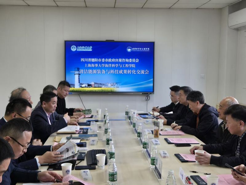 On November 5th, Liu Shoupei, the director of the Decision-making Consultation Committee of the CPC Deyang Municipal Committee and the Deyang Municipal Government of Sichuan Province, led a delegation to visit the College of Marine Science and Engineering of Shanghai Maritime University. Both sides held an exchange and discussion on cooperation in areas such as clean energy equipment and the transformation of scientific and technological achievements. Jin Yongxing, the former Party Secretary of the university, Wang Weiyi, the Party Secretary of the College of Marine Science and Engineering, and Feng Daolun, the Deputy Party Secretary and Dean of the College, attended the reception and participated in the symposium. Wang Weiyi presided over the meeting.
